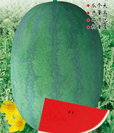 ■ 特征特性 :早中熟種,坐果至成熟28天左右,全生育期90天左右。植株長勢穩(wěn)健,抗病抗逆性強,生態(tài)適應(yīng)性廣,易坐果。果實橢圓形,果皮墨綠色底上覆暗條帶,果面光滑無棱帶蠟粉。瓤色深紅,瓤質(zhì)酥脆,中心糖14%左右,口感好,風(fēng)味佳。平均單果重8-10kg左右,大者20kg以上(特殊栽培),一般畝產(chǎn)6000公斤以上。皮厚1.0cm左右,果皮硬度強,耐儲運。高抗枯萎病抗重茬,兼抗炭疽病和病毒病,在2年重茬地種植,其產(chǎn)量品質(zhì)無明顯差異。綜合性狀優(yōu)于目前抗病品種。