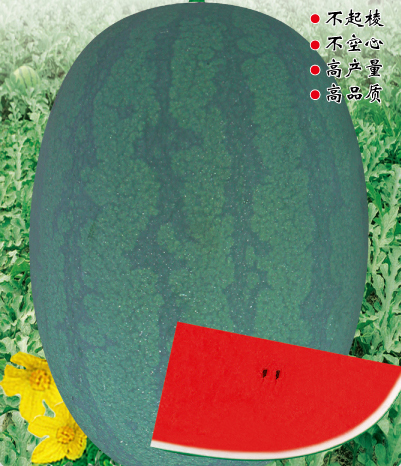 ■ 特征特性 :早熟種,雌花開(kāi)放果實(shí)成熟28天左右。全生育期90天左右。植株長(zhǎng)勢(shì)穩(wěn)健,抗病抗逆性強(qiáng),適應(yīng)性廣,易坐果。果實(shí)橢圓形,果皮墨綠色底上覆暗條帶,果面光滑無(wú)棱帶蠟粉。瓤色深紅,瓤質(zhì)酥脆,中心糖14%左右,口感好,風(fēng)味佳。平均單果重8-10kg左右,大者20kg以上(特殊栽培),一般畝產(chǎn)6000公斤以上。皮厚1.0cm左右,果皮硬度強(qiáng),耐儲(chǔ)運(yùn)。