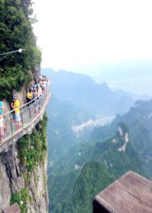 7日早上,我們來到了此行第一站——天門山。天門山海拔1500多米,因自然奇觀天門洞而蜚聲世界,被譽(yù)為“湘西第一神山”和“武陵之魂”。我們乘著觀光大巴沿著逶迤曲折的公路盤旋而上,只見壁立千仞,懸崖萬丈,每逢轉(zhuǎn)彎,車內(nèi)一片驚呼,盡顯刺激與緊張。下車后,我們繼續(xù)前行,當(dāng)大家爬過999層階梯最終到達(dá)巨大的天門洞前時,不禁感嘆大自然的鬼斧神工,神秘玄奇。往下眺望,林木蒼翠,山腳下的湖波像綠寶石一樣鑲嵌其中,美不勝收。清風(fēng)徐來,令人神清氣爽,視野開闊,豪氣頓生。天門山上的玻璃棧道,依峭壁凌空而建,讓人望而生畏,行而卻步。大家都小心翼翼,體驗雙腳處于萬丈深谷之上的驚險。