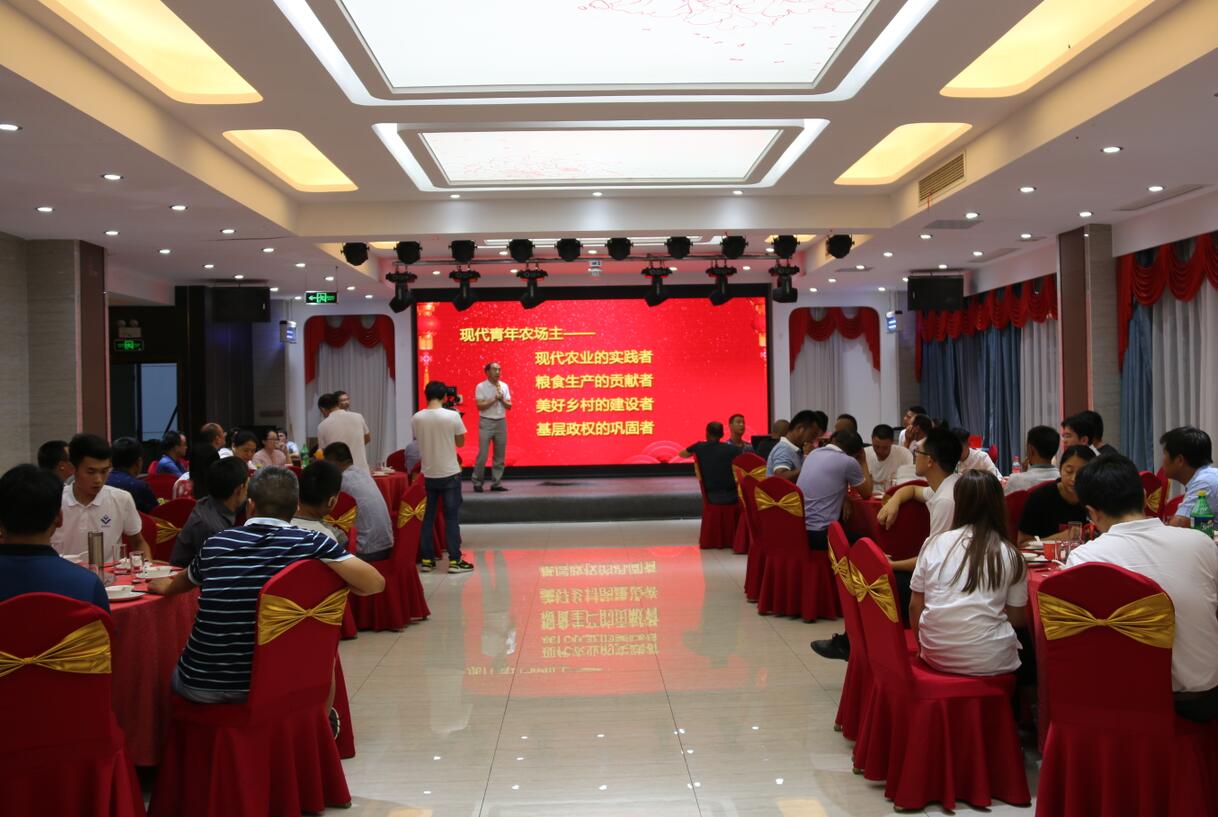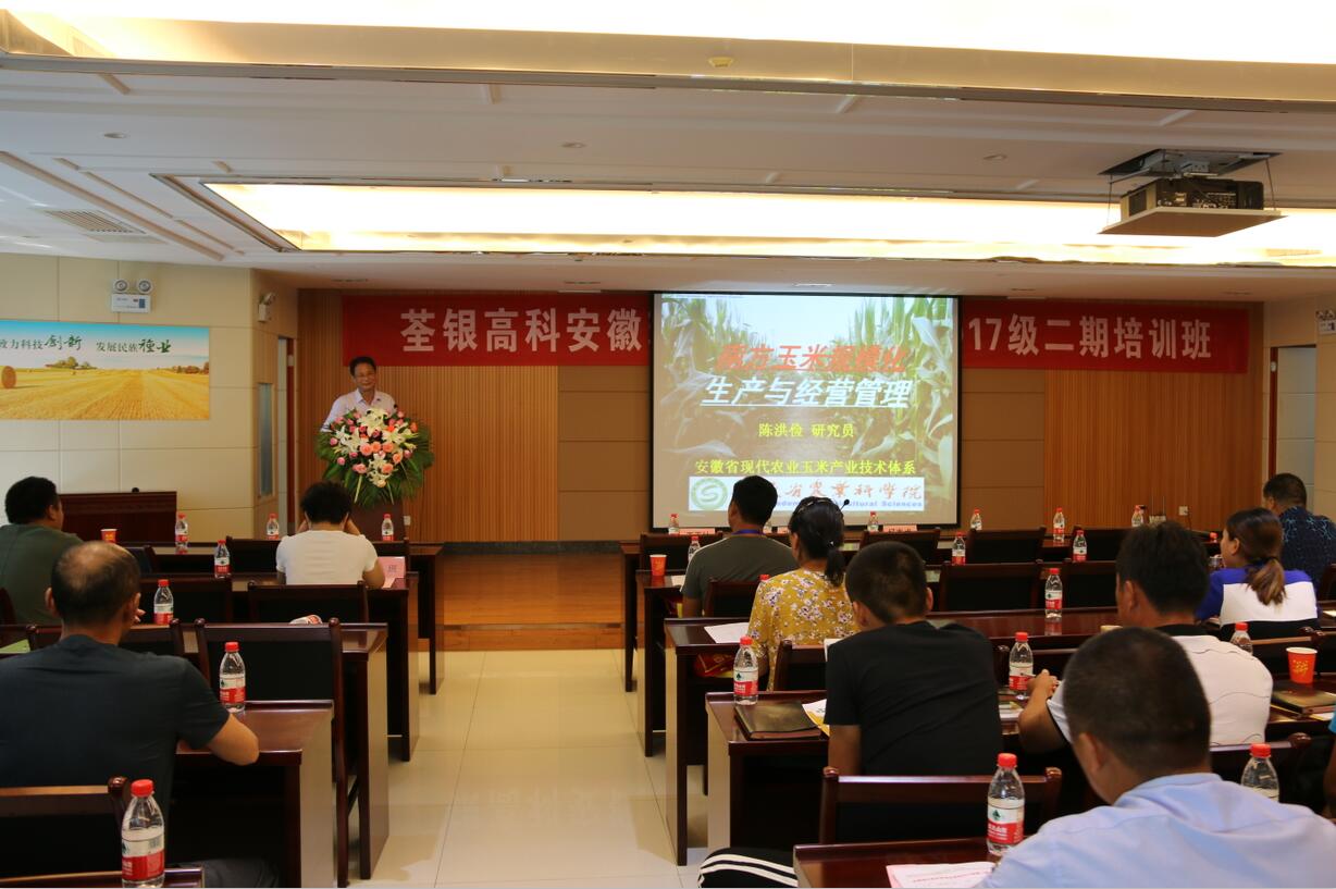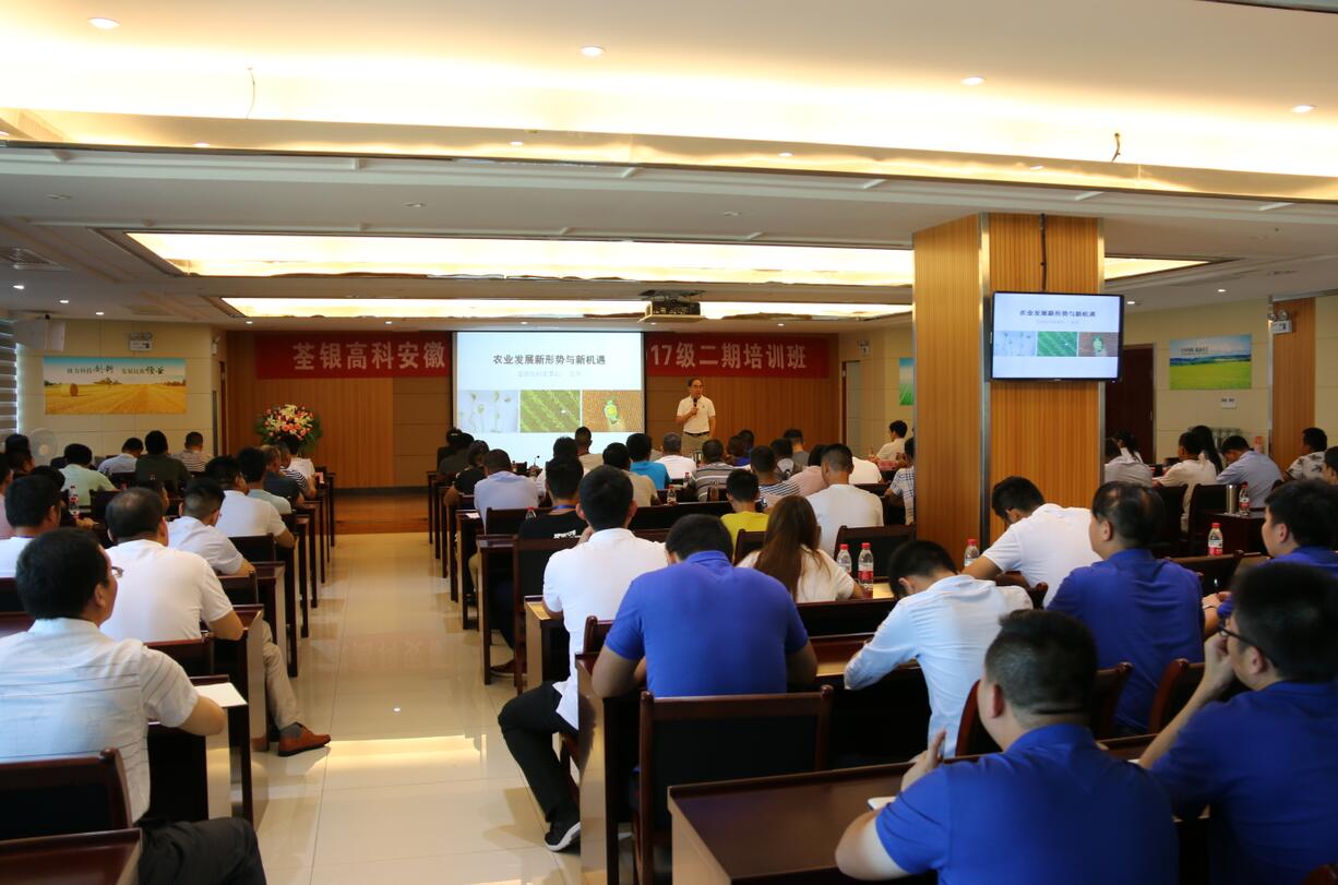 ??? 2018年7月19日,由安徽省農(nóng)委主辦、荃銀高科承辦的安徽現(xiàn)代青年農(nóng)場主培訓(xùn)2017級第二期培訓(xùn)活動在公司六樓多功能廳展開。安徽荃銀高科董事長張琴、營銷總監(jiān)王玉林,培訓(xùn)班總教務(wù)長楊惠成老師,安徽張海銀基金會秘書長張彤,及來自全省各地的100多位從事種植業(yè)的農(nóng)場主學(xué)員參加了培訓(xùn)。